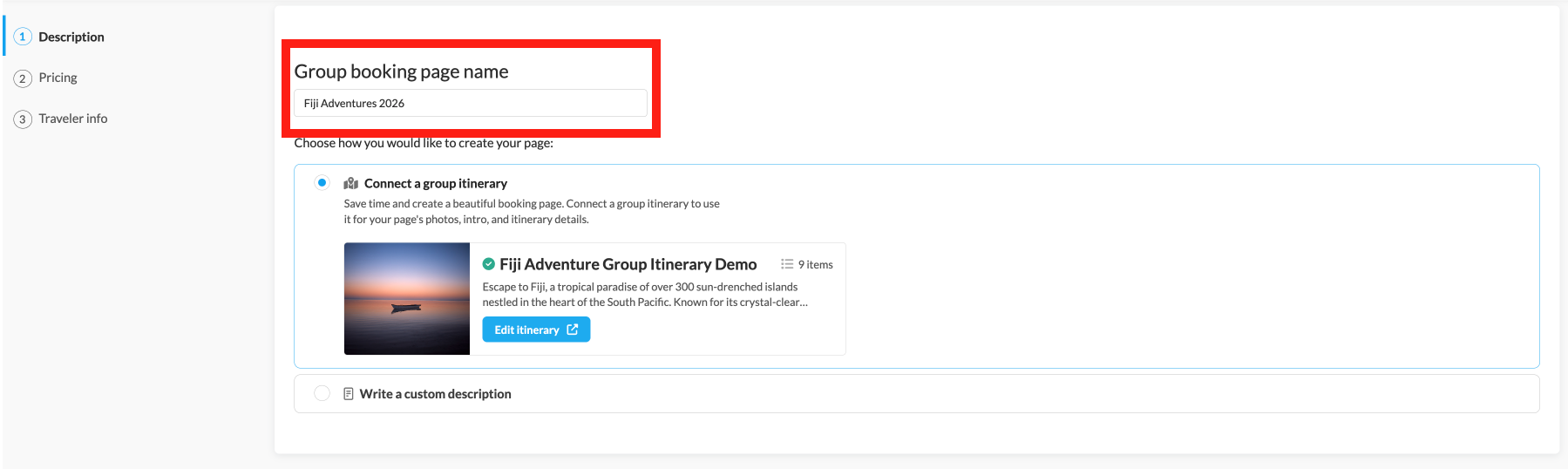 From here, you can choose to connect a group itinerary (recommended) or write a custom group booking page description.