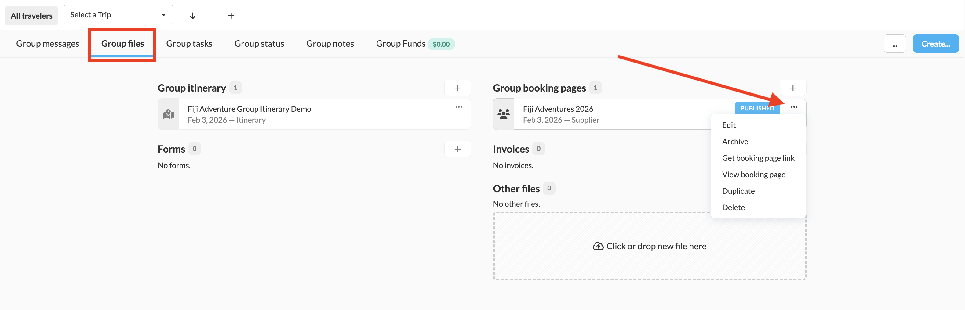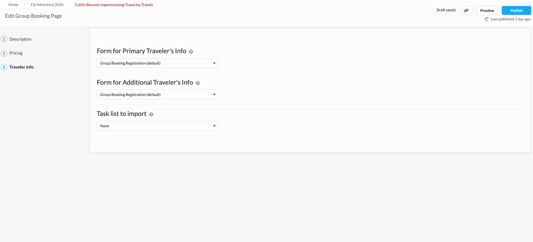 Almost every group you create in TravelJoy will have a group booking page. The page automates several tasks that you'd otherwise need to handle manually for every single room that's booked -- things like creating the trip, invoice, and payment schedule, sending forms, setting up automated reminder emails -- and unlocks some powerful tools like package inventory and managing roommates.