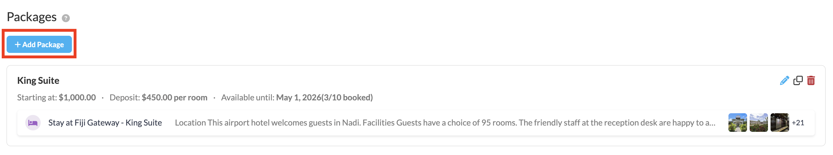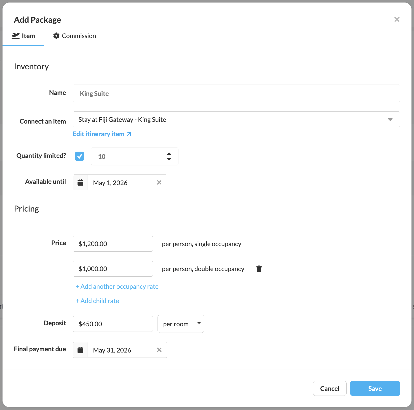 Packages usually represent one room or cabin type in your group, so that your clients can choose from all available lodging options during booking. Packages have a number of options, from occupancy-based pricing and child pricing to inventory control. Learn more