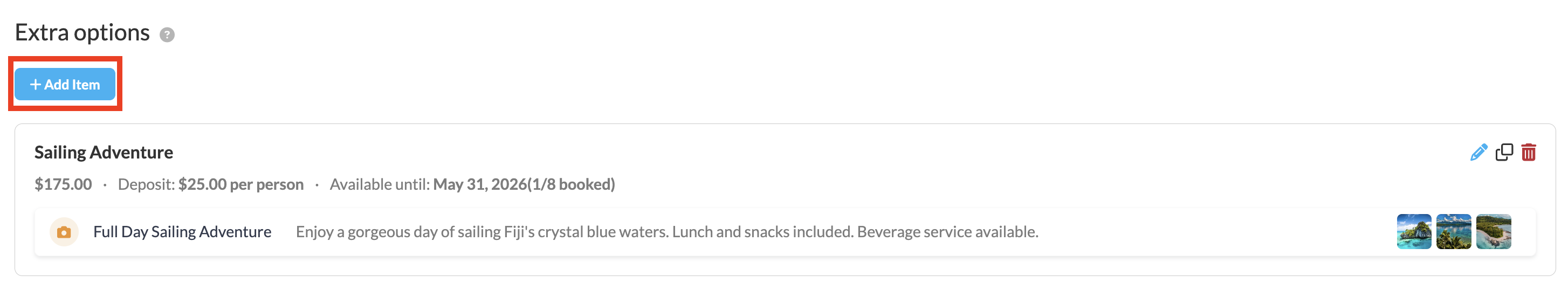 Like packages, extra options are additional items, such as excursions, which can be booked by your clients. However, they are optional, and can be booked in multiple quantities. Each item can be customized in various ways. Learn more