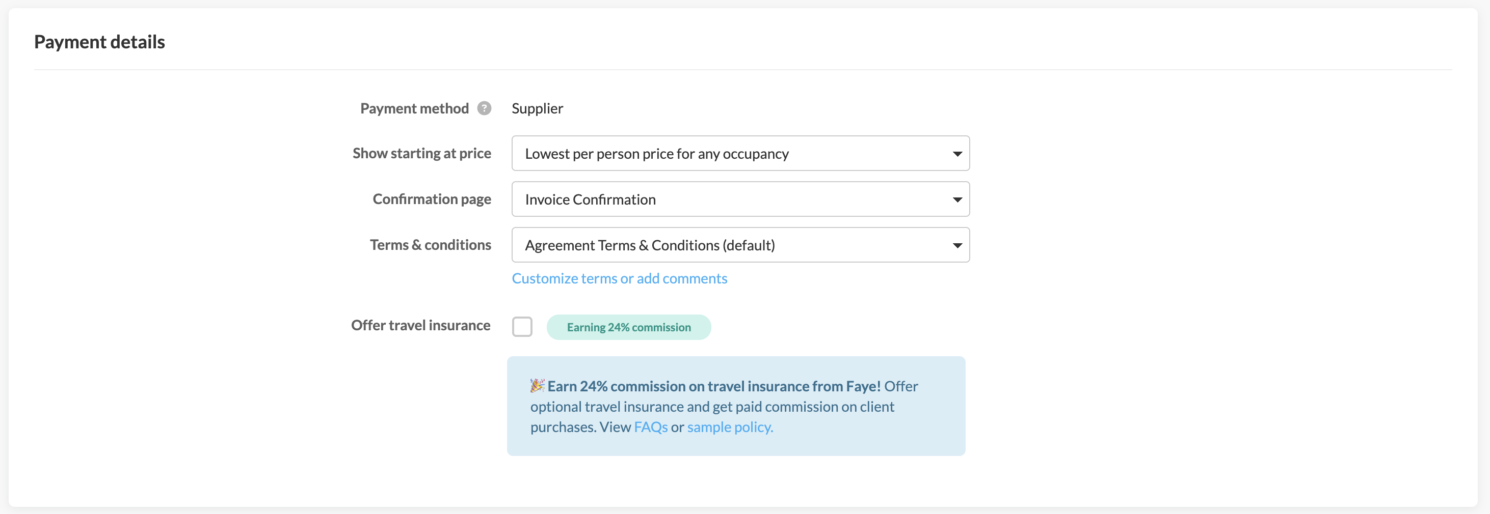 This is where you'll choose the set of terms and conditions that your client will accept during checkout. By default, your group booking page will use either the "Invoice (Supplier)" or "Invoice (Direct)" built-in templates.