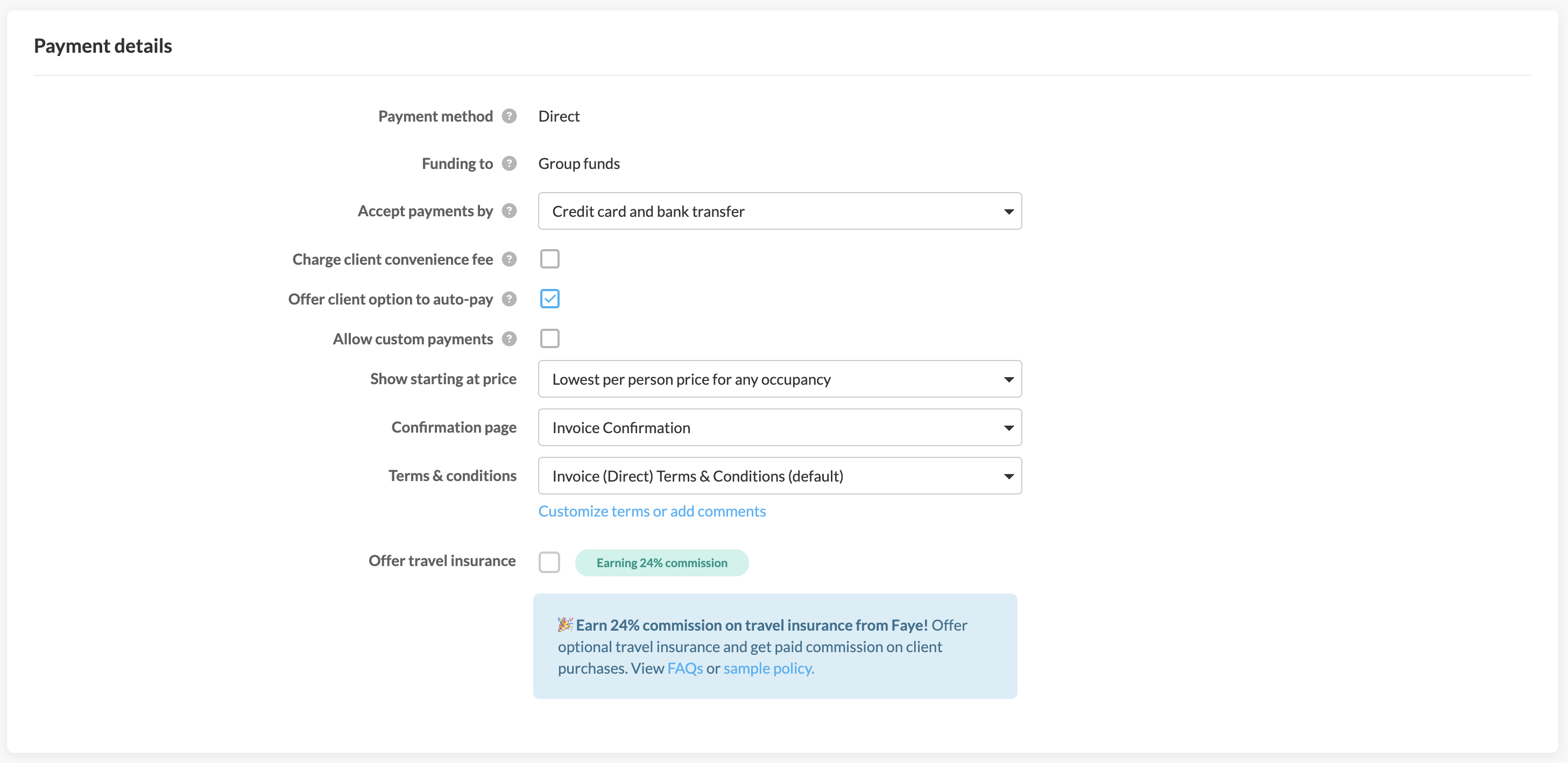 This is where you'll choose to add Faye travel insurance to each client's invoice. After completing the brief mandatory licensing and onboarding video (only the first time you offer insurance), you’ll be prompted to enter the destination, travel dates for the group, and you'll be given the option to enable CFAR (cancellation for any reason) coverage.