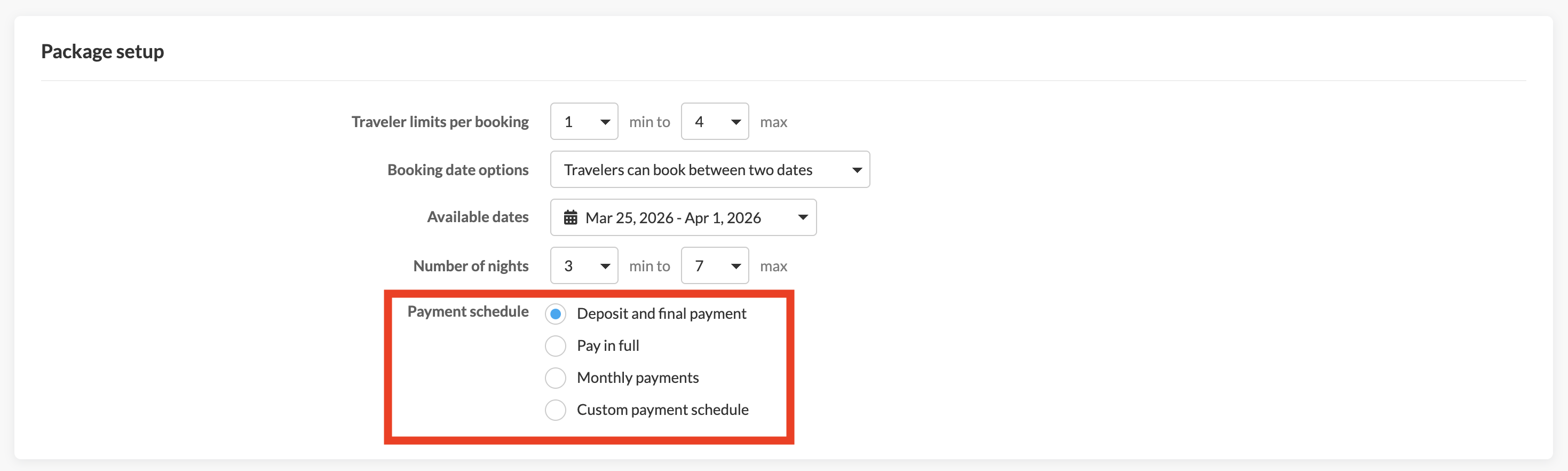 Traveler limits set the minimum and maximum number of travelers allowed per room for your group. This applies to all packages on the group booking page. If some rooms allow double occupancy and others allow triple occupancy, set the maximum to three to accommodate all options.