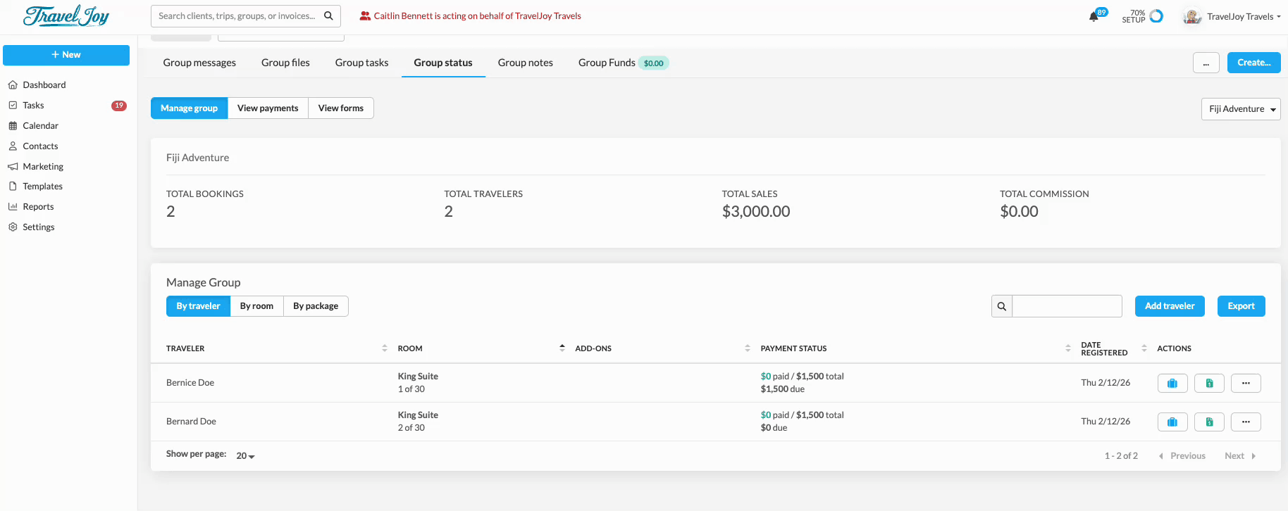 Using the Group Status page, you can move travelers around however you'd like. Pair up solo travelers, split a quad-occupancy into two doubles, swap roommates between two rooms of the same type, and more. The clients' files and messages will move right along with them, and invoices will be adjusted based on occupancy when applicable.