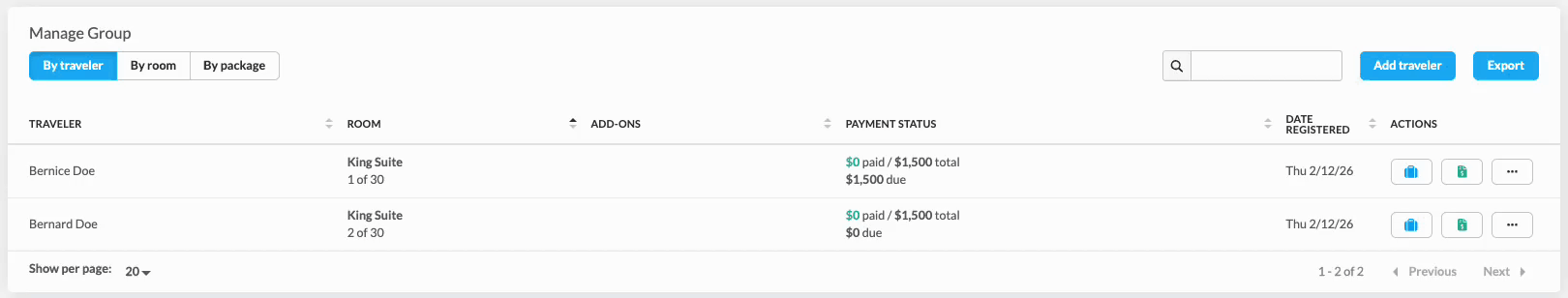 When using a group booking page, it's easy to track, manage, and export the rooming list, even if that list goes through a lot of changes during the booking phase.