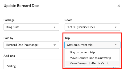 From here, choose their roommate’s booked room under the "Room" dropdown, choose who will be paying for their invoice, and then decide whether you want the two travelers to stay in the same trip or remain in separate trips (they can still share a room even if they’re listed in different trips).
