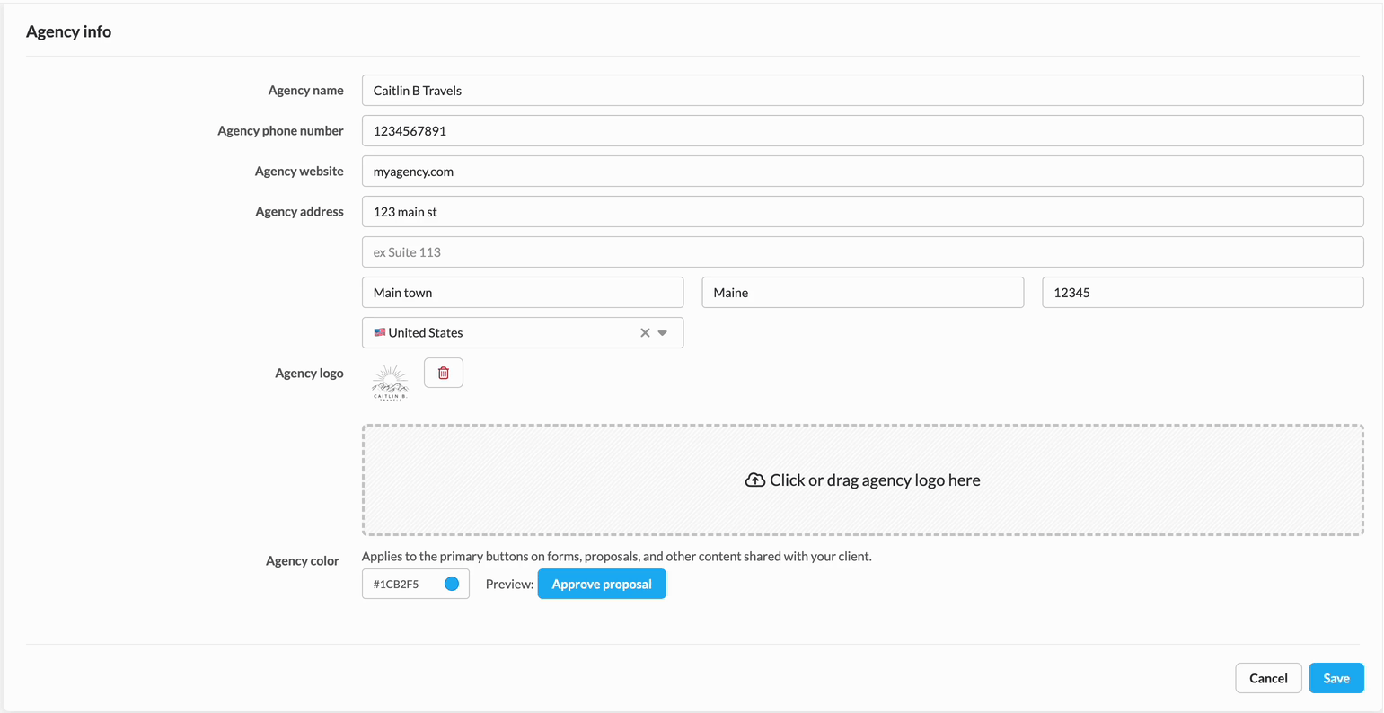 Your agency name will show up on communication to your client. It will appear in the document cover photos and invoices that you send to your client, and will also appear on your client's credit card statement if you invoice them through TravelJoy.