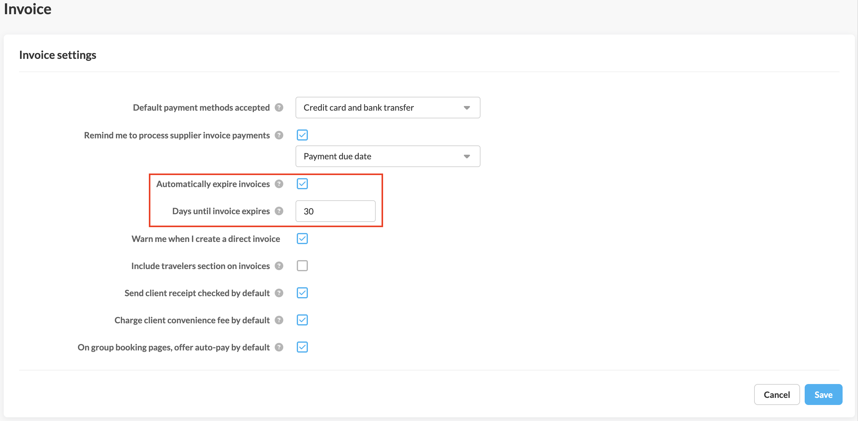 You can enable and change the number of days for automatic expiration under Settings → Invoice: