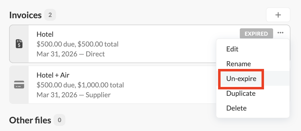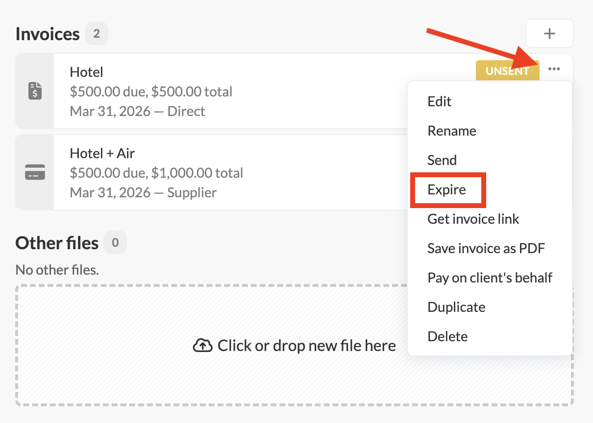 For any individual invoice, locate the invoice file within the client's trip and click the "..." menu on the top right of the file. From here, you can choose to "Expire" (if applicable) or "Delete" the invoice.