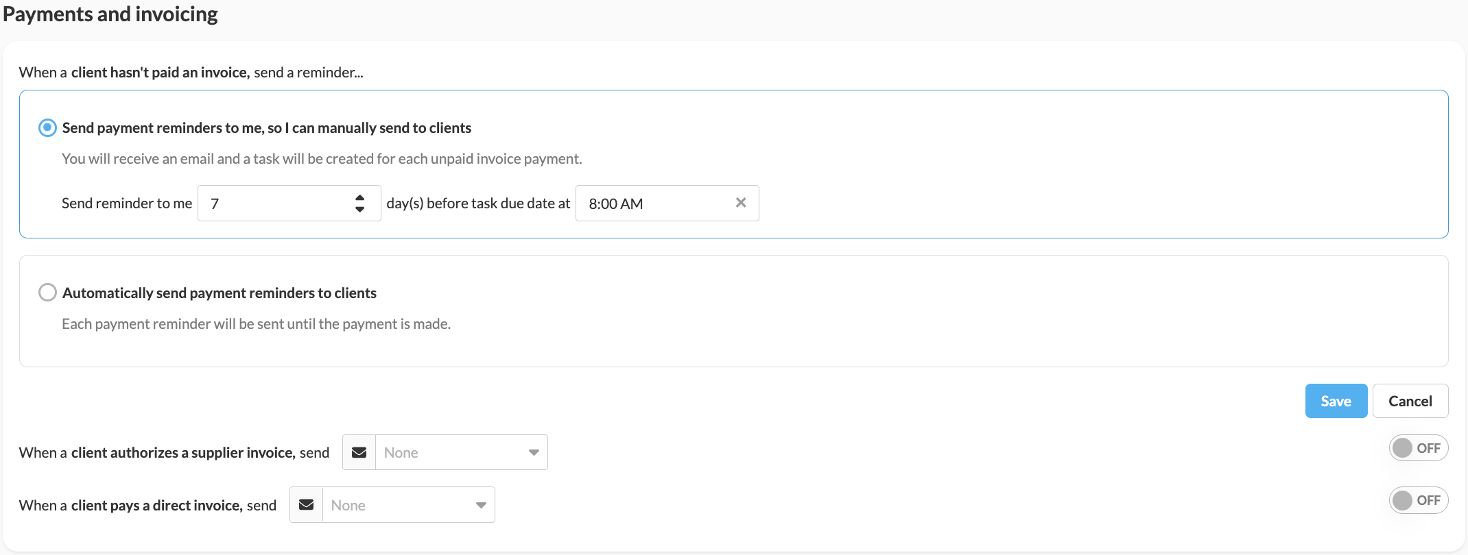 The next step is to make sure you have payment reminders set up on your account. You can tell TravelJoy how far in advance to send you these notifications under Settings -> Automation in the left-side navigation menu (or click here).