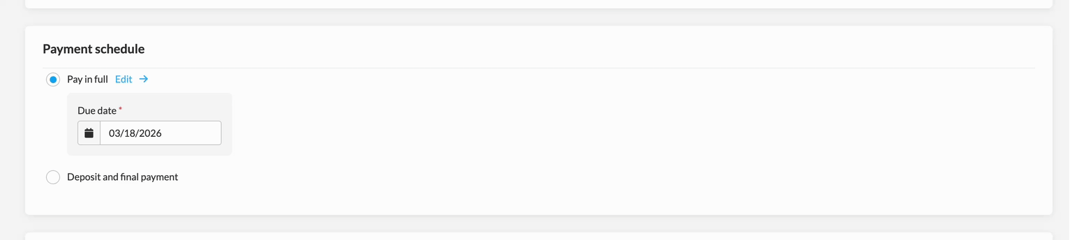 You can choose one of two default options: Pay in full or Deposit and final payment. Both options allow you to select your own payment due dates.Â