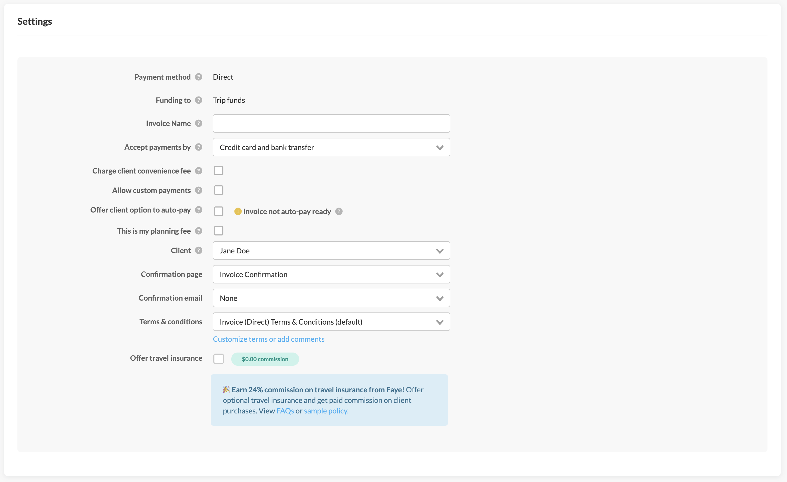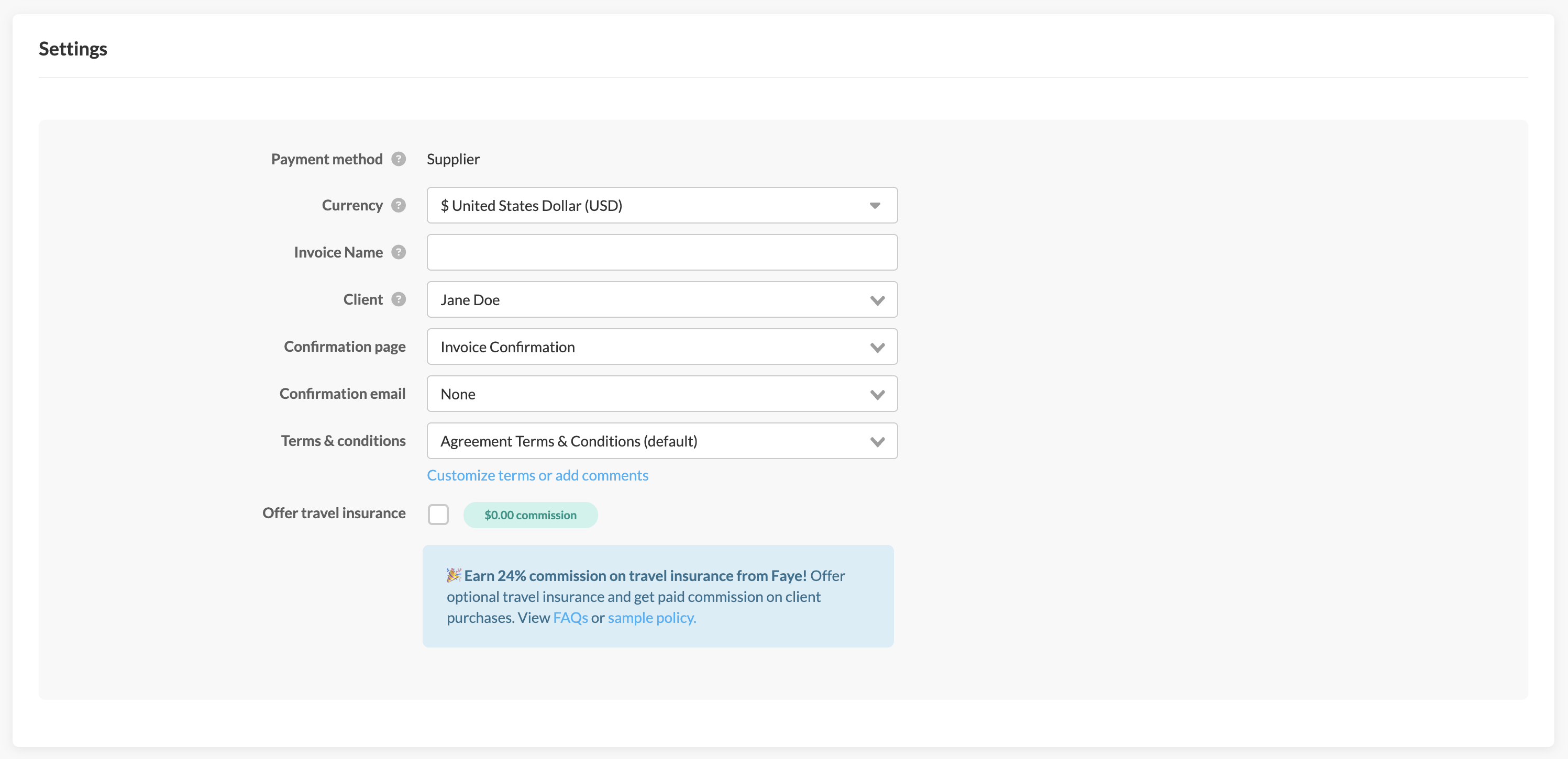 The last section within your invoice features your invoice settings. This is where you can manage important details such as the invoice name, which client on the trip this invoice is associated to, the thank you message and confirmation email you'd like sent to clients after they complete a payment, and - most importantly - the terms and conditions your clients will agree to upon payment. You can also add Faye travel insurance to any invoice from this section.Â