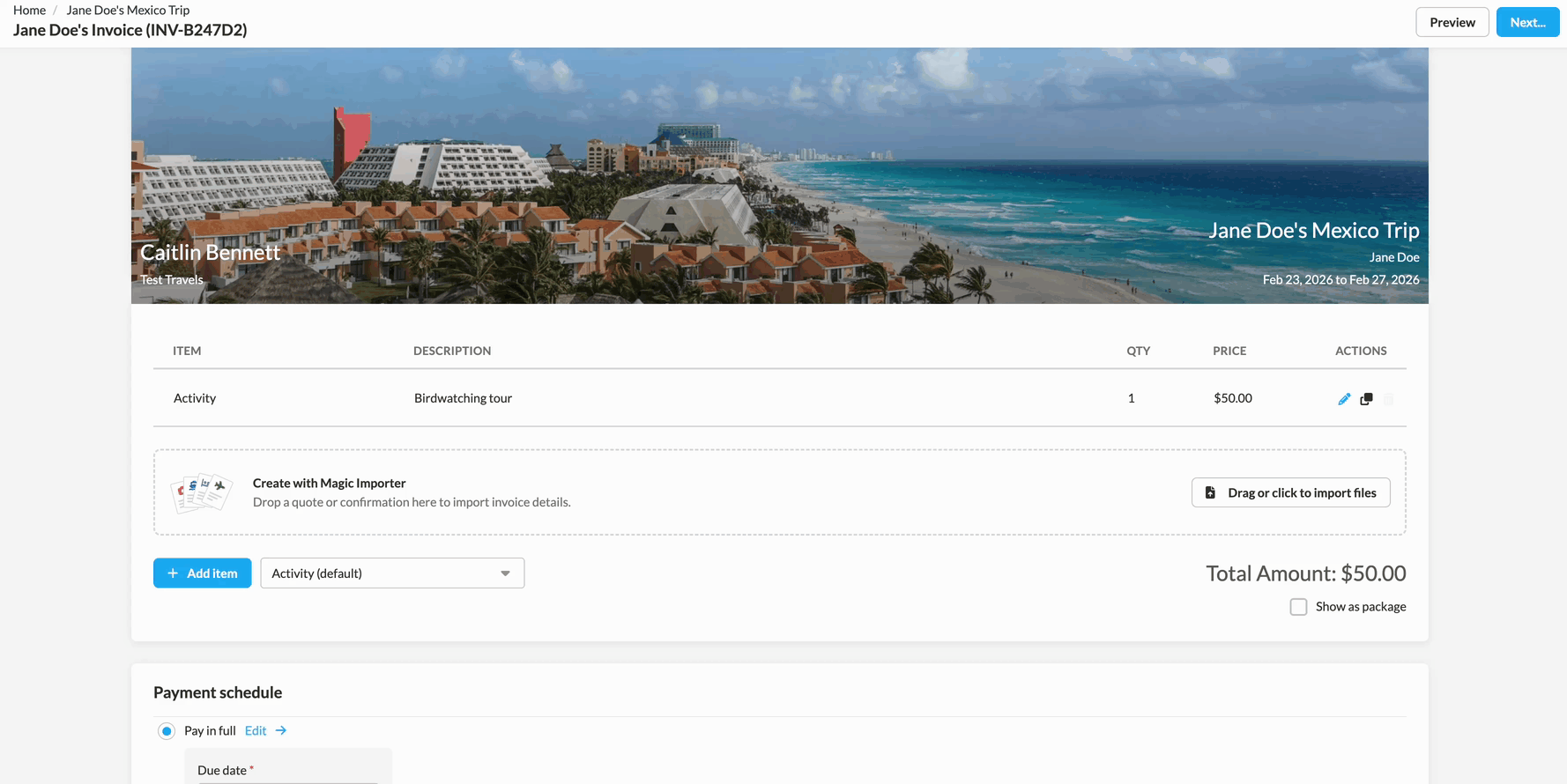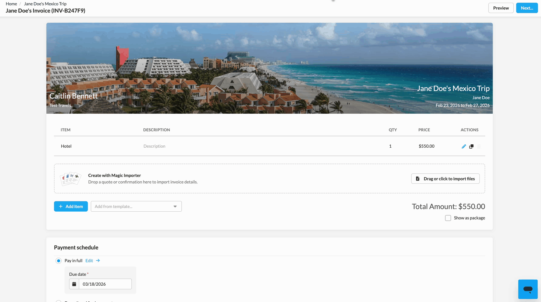 Invoices can be used to securely collect credit card authorizations or payments from your clients directly through TravelJoy. Invoices allow you to build out detailed line items and custom payment schedules that suit you and your clients needs.Â