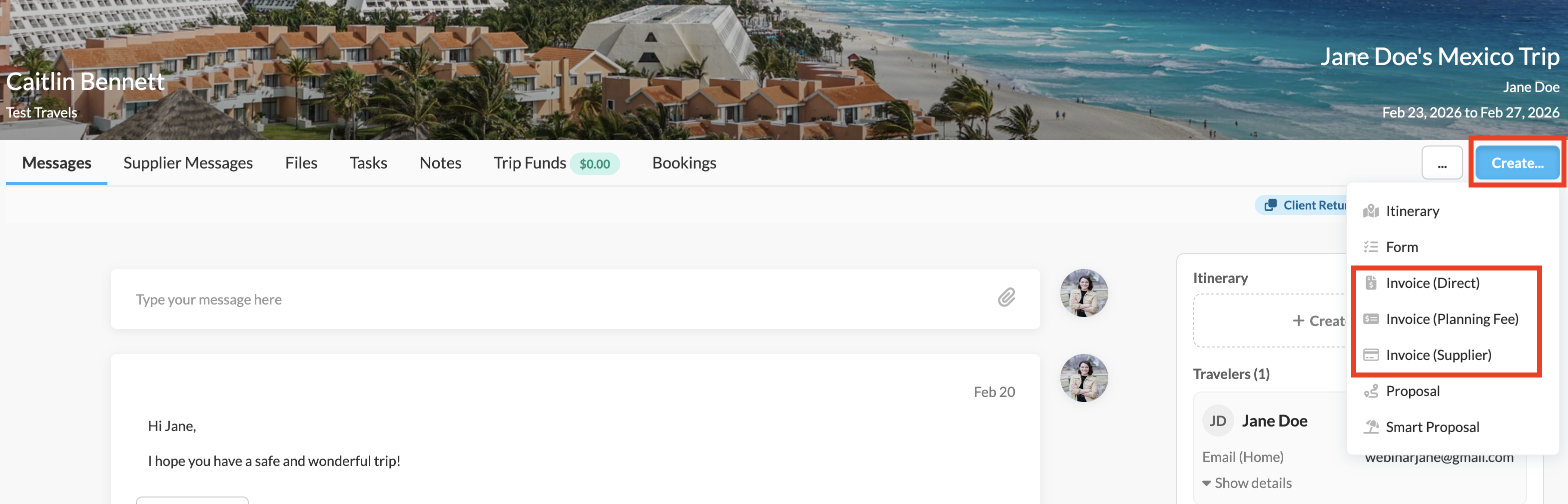 Use an Invoice (Direct) to charge your client's payment method directly, pulling their payment into your trip or group's Funds balance. This allows you to pay suppliers and withdraw markup and planning fees.Â
