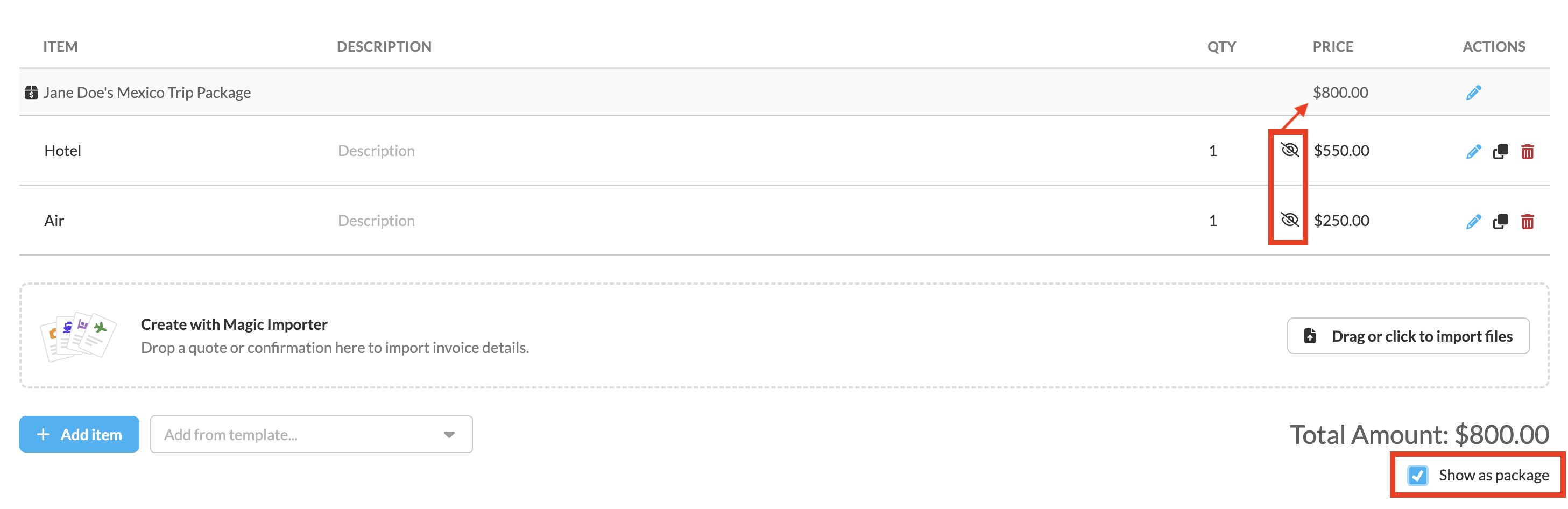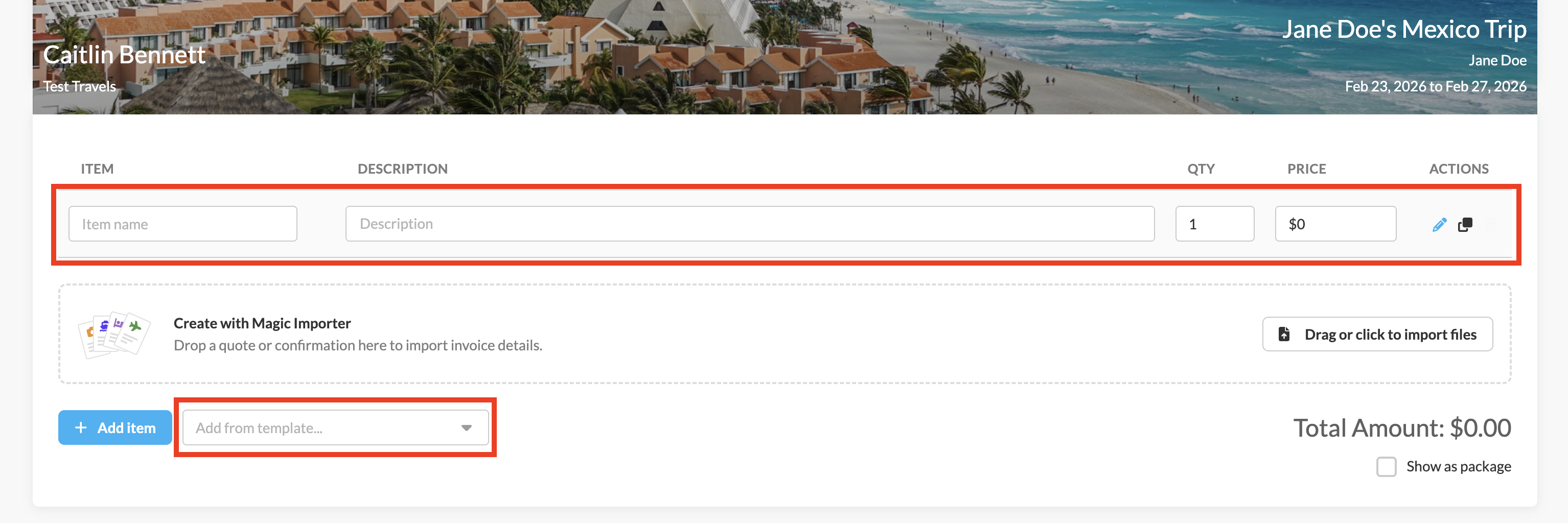 In the first section of the invoice, create line items (things like hotels, airfare, packages - whatever works for you!) with a description and pricing or use a invoice item template by utilizing the "Add from template..." drop down menu:Â