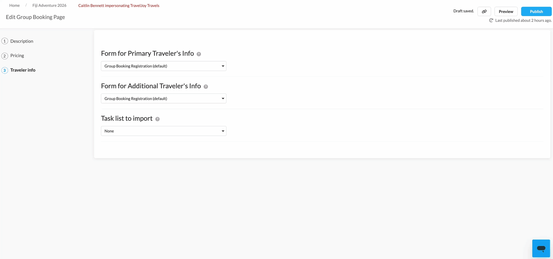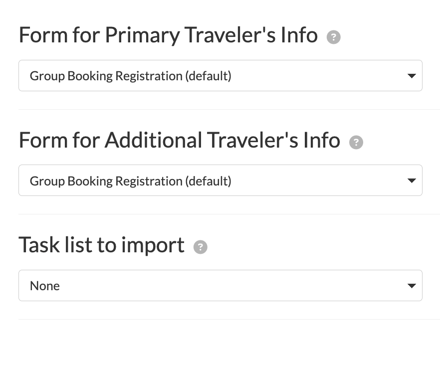 Finally, in step 3, you'll choose the forms to be filled out by the primary traveler and any additional travelers. You'll also have the option to add a task list to your group that will import on every trip created from the group booking page: