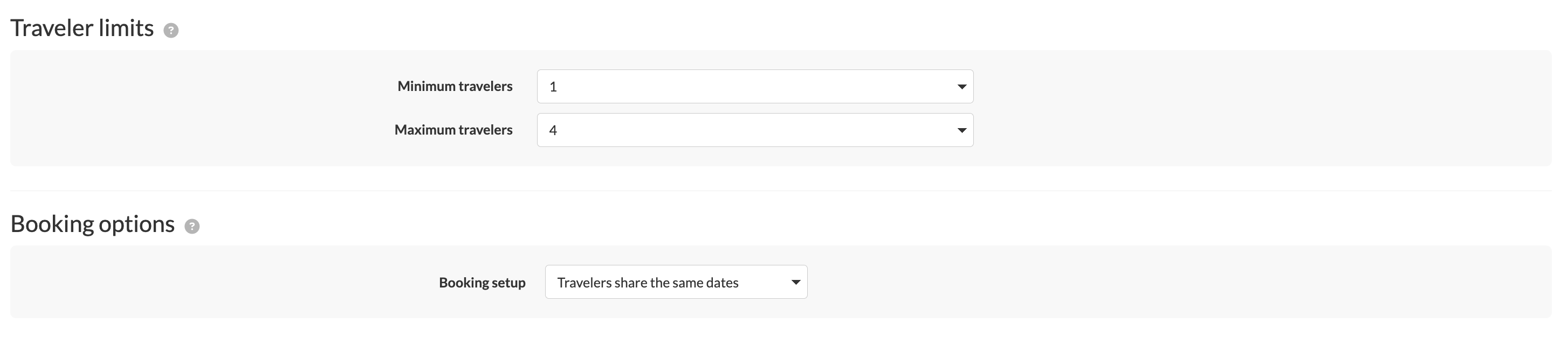 You'll start by adding traveler limits (how many folks can book a single room or cabin) then booking options (the date ranges and options you'd like to offer your clients):