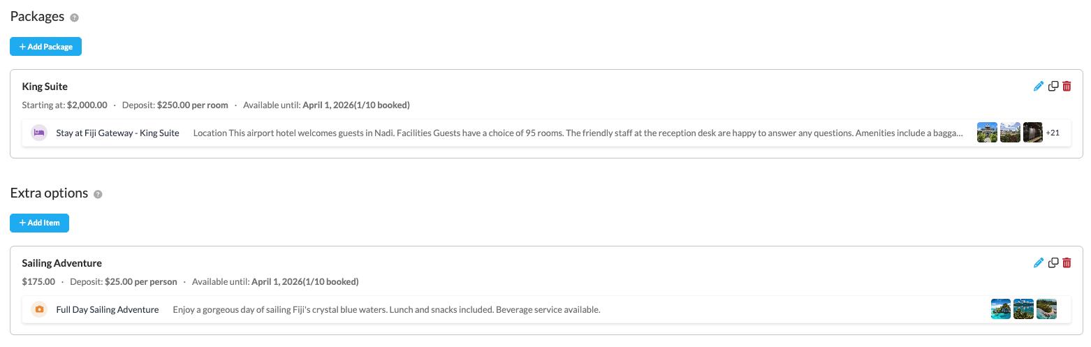Use the blue "+ Add package" or "+ Add item" buttons to add as many packages or extra options for your clients to choose from.