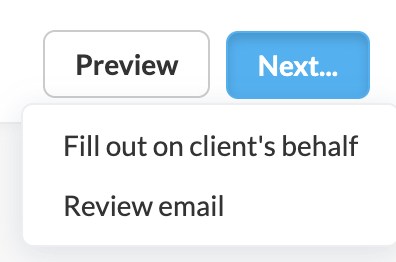 From here, you can click "Preview" at the top to see what the form will look like to your client, or you can select the "Next..." button to fill out the form on your client's behalf or review the email accompanying the form: