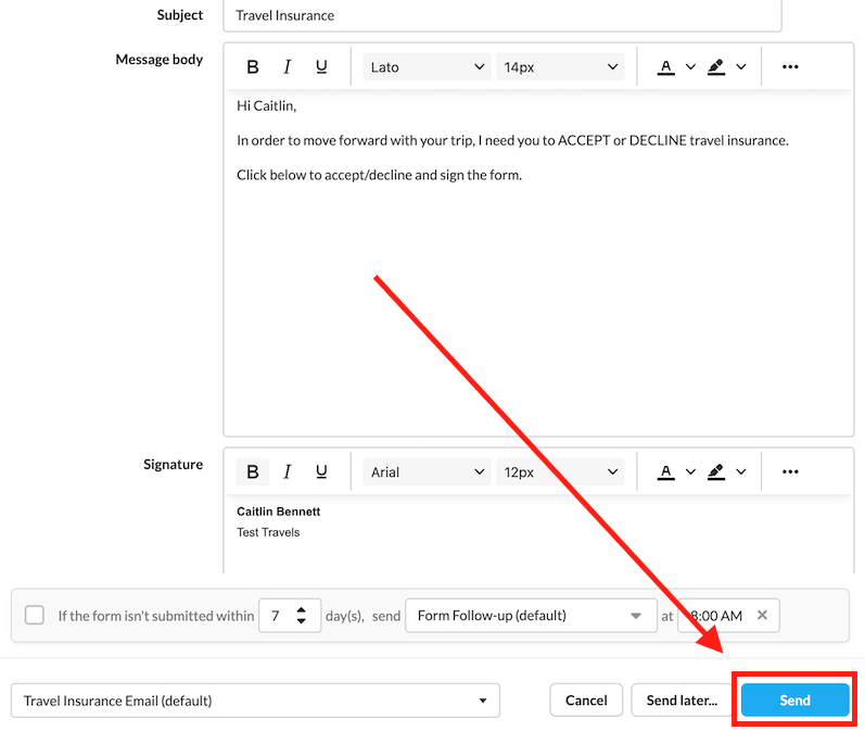Once you've reviewed the email contents and are ready to send it off with your form, select the blue "Send" button at the bottom of the pop up: