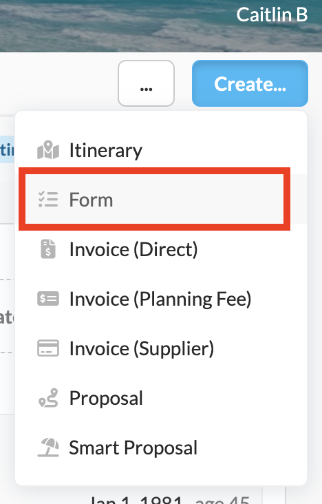 Everything starts with a trip, so if you have not already - we recommend creating a trip. Within that trip, click the blue "Create..." button at the top right of the page and select "Form" from the options that appear: