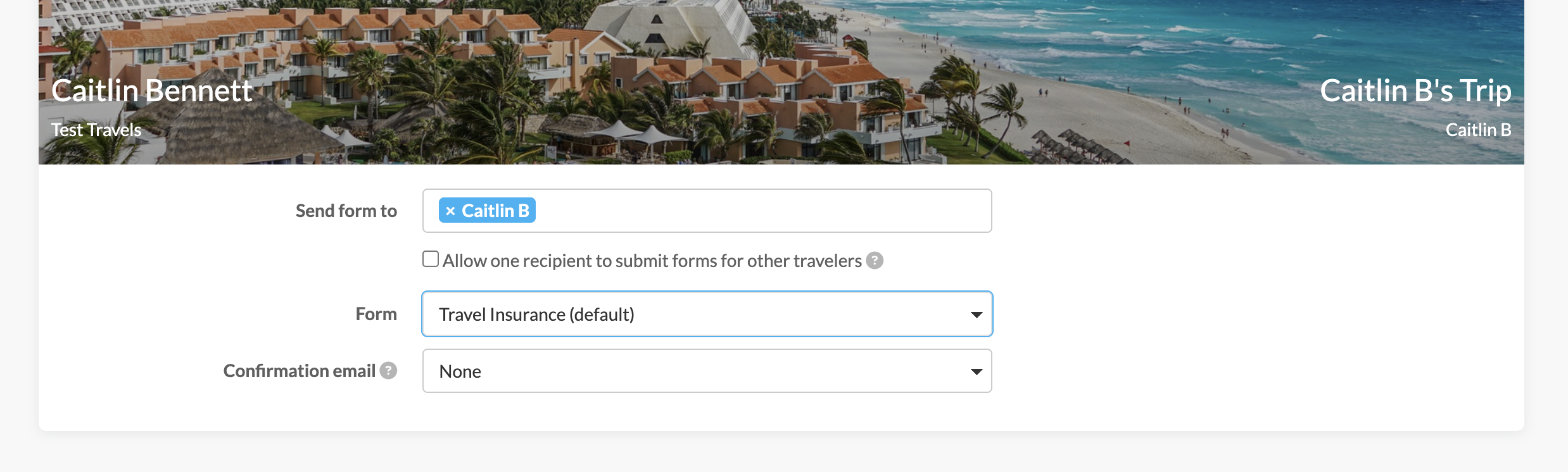 On the next page, you'll see the option to select which of the trip's traveler will receive the form, the ability to allow one traveler to fill out the form on behalf of all travelers, which form template you'd like to send, and which confirmation email you'd like triggered after the client completes their form: