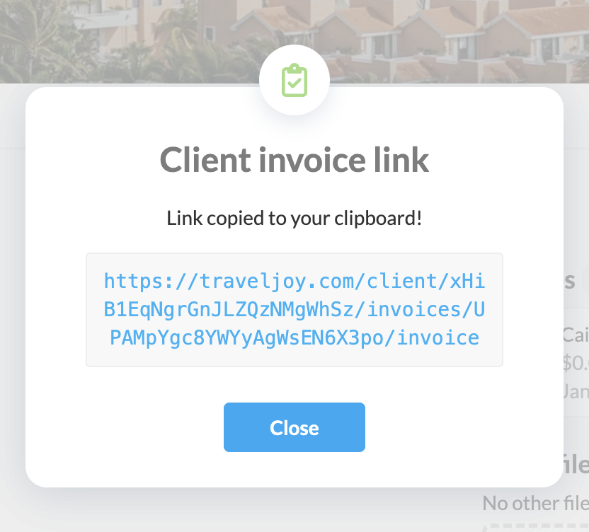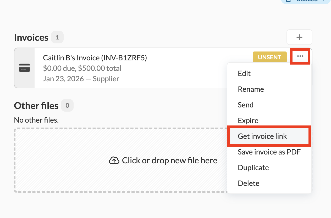 To find the link to a client's form or invoice, go to the trip Files tab and locate the file in question. At the top-right corner of this file, click the three dots and then click "Get ______ link" (In this case "Get invoice link"):