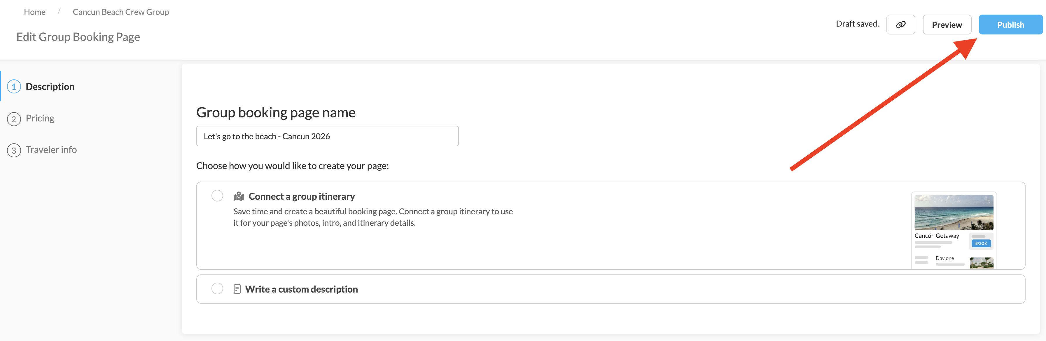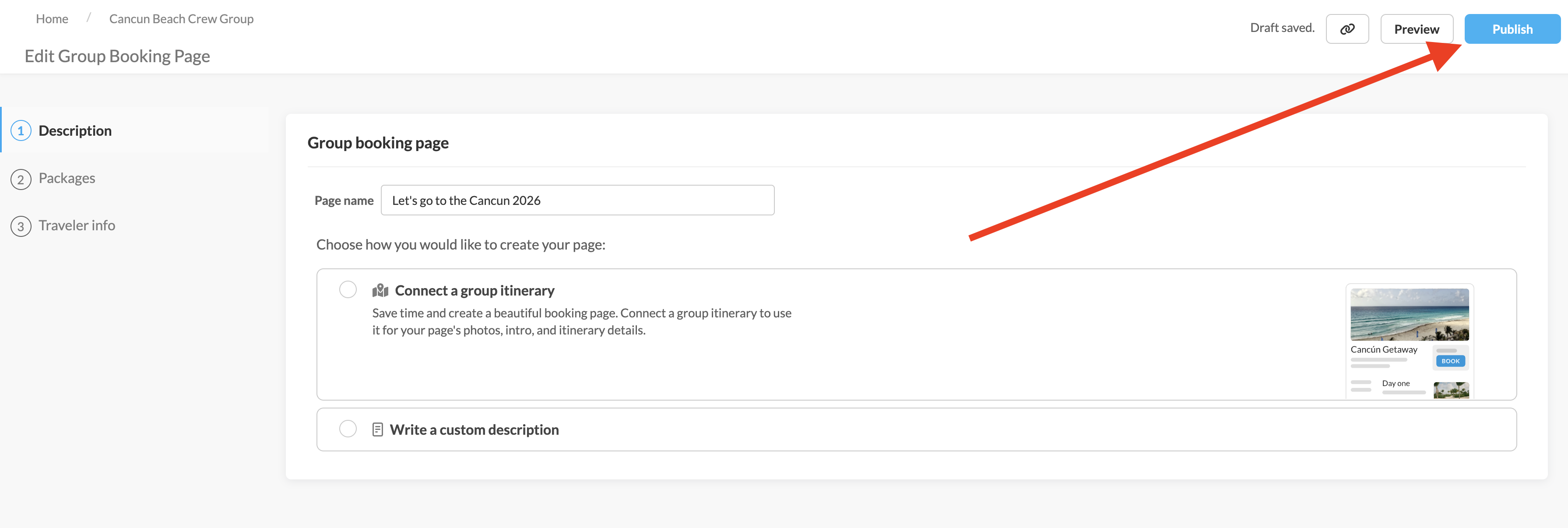 | 💡 Note: The editing screen will autosave as you work, however, all edits will not be visible to your clients on your group booking page until the "Publish" button is clicked. |