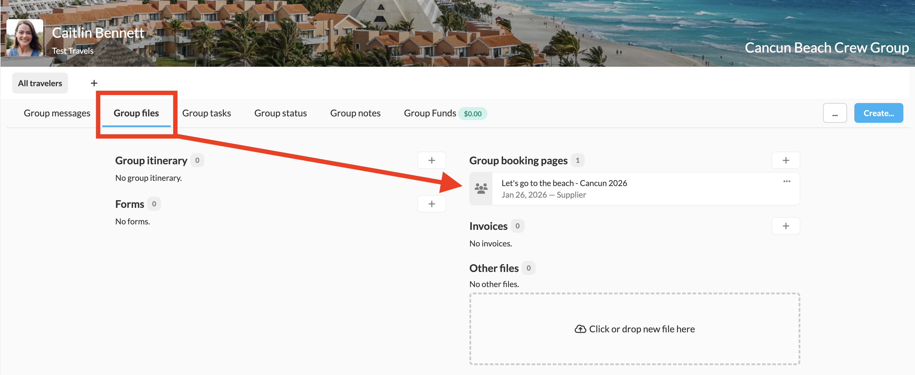 Once you've opened the group, navigate to the "Group Files" tab, and find the group booking page under the "Group booking pages" section: