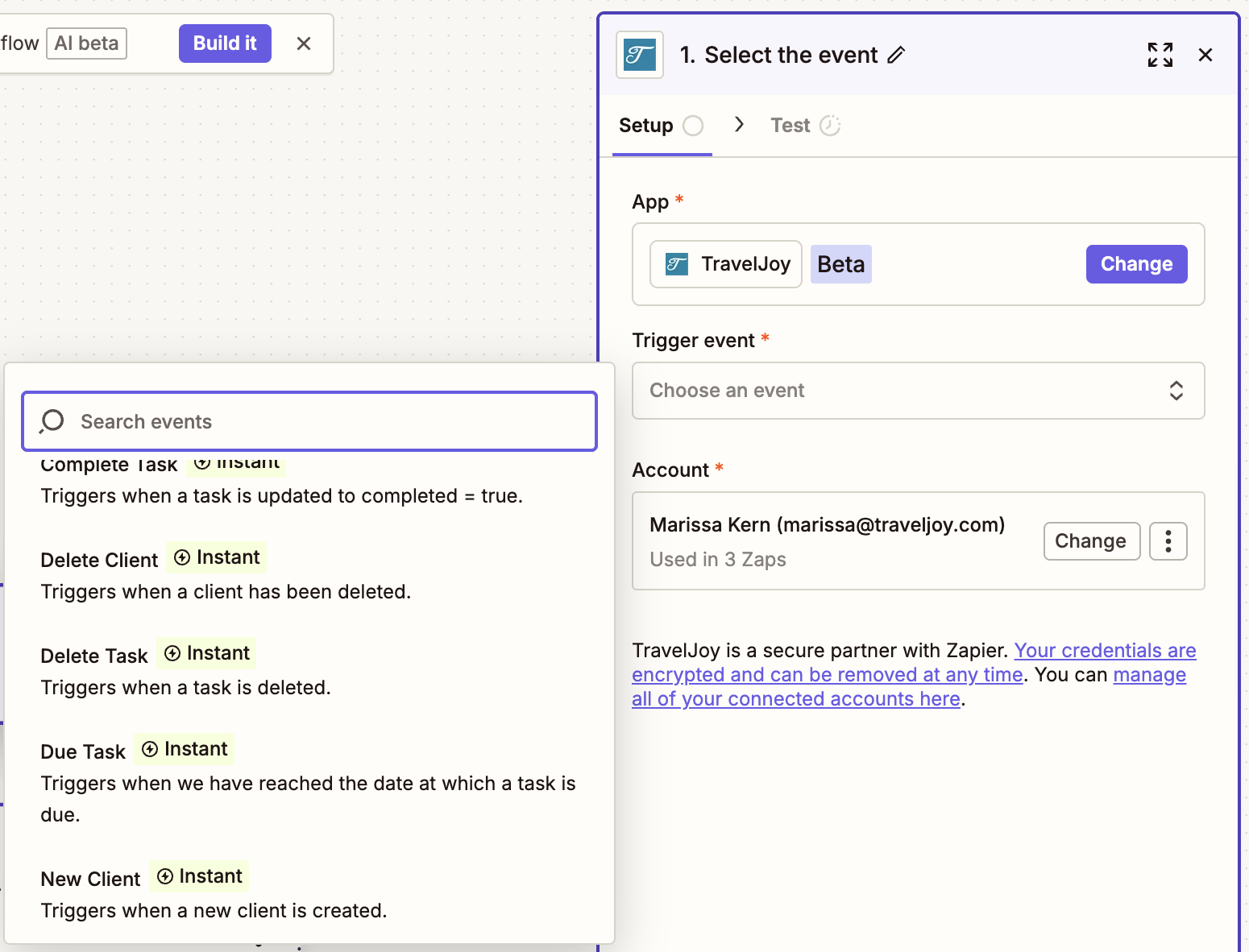 - Connect your TravelJoy account when prompted. This opens a small authorization window where you log in to TravelJoy and approve Zapier access. (If you are unable to connect, this is likely because you have not purchased either the Premium membership or Zapier add-on)
