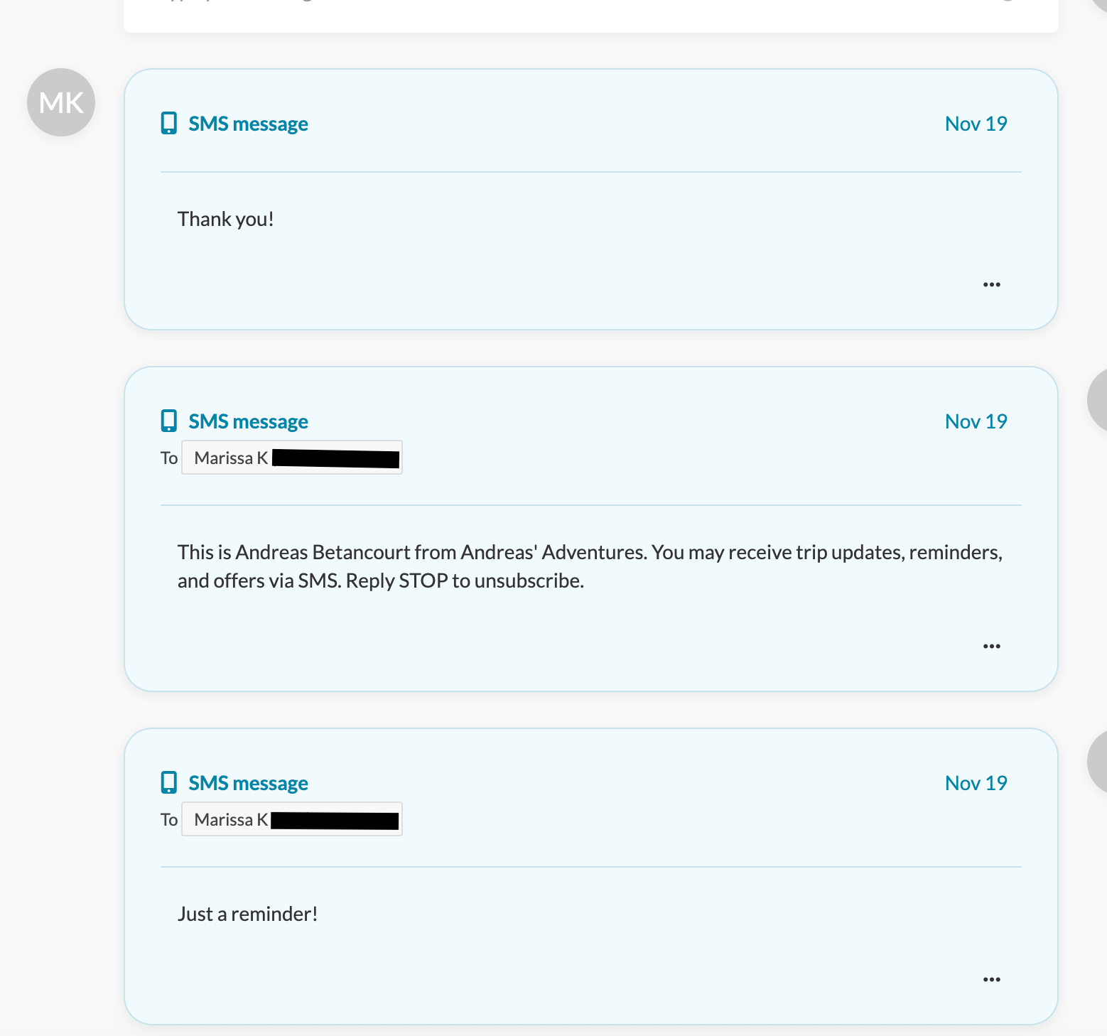 When a client replies to your message, you will be notified by email, and those replies will also go straight to the trip's message feed. Text messages will be blue: