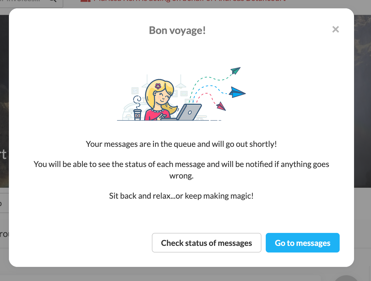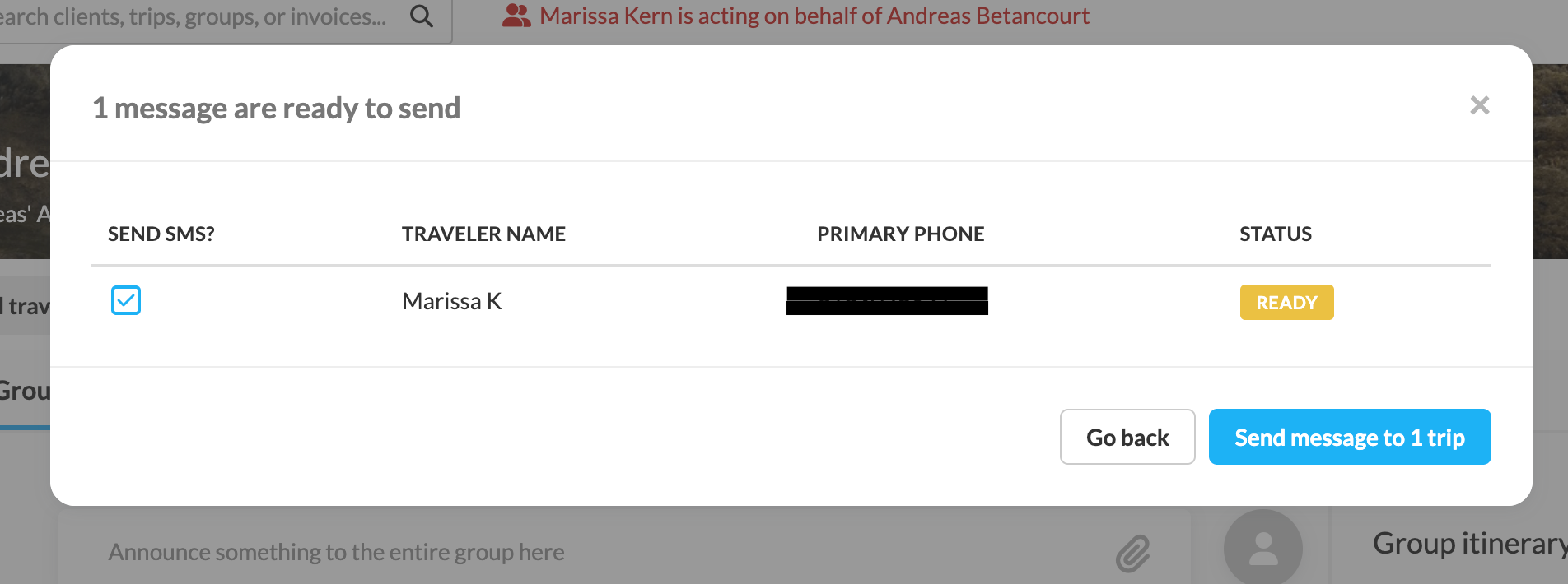 You will see a pop-up screen allowing you to select some or all travelers to send the message to. Once the desired recipients are selected, click the “send message to # trips” button
