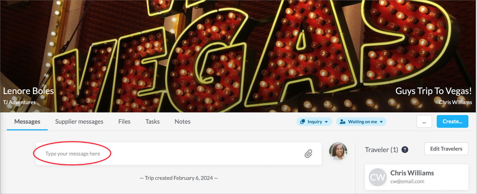 When the trip loads, you will be taken directly to the Messages tab, where you can send your message. To get started, click inside the white box that says "Type your message here," as seen below: