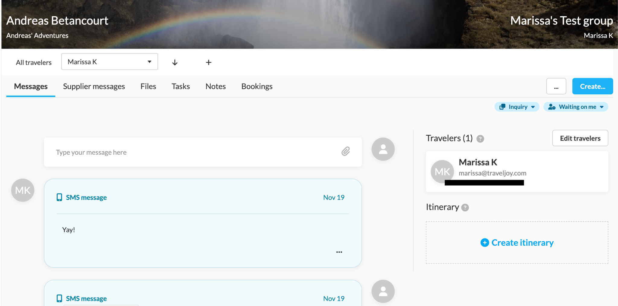 By default, sending a message from a trip's Messages tab will send an email to the primary traveler. However, you now have the option of sending your clients a text message!
