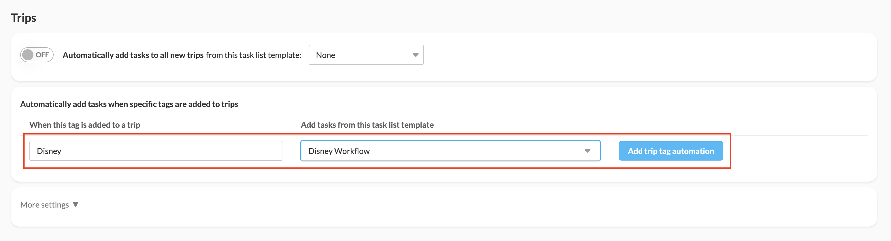 Tags can be added to a trip to automatically import a task list within that trip. To get started, create a trip tag in your Automations tab and link it to a task list template. From there, anytime you apply that tag while editing trip details, the associated task list will be added automatically.
