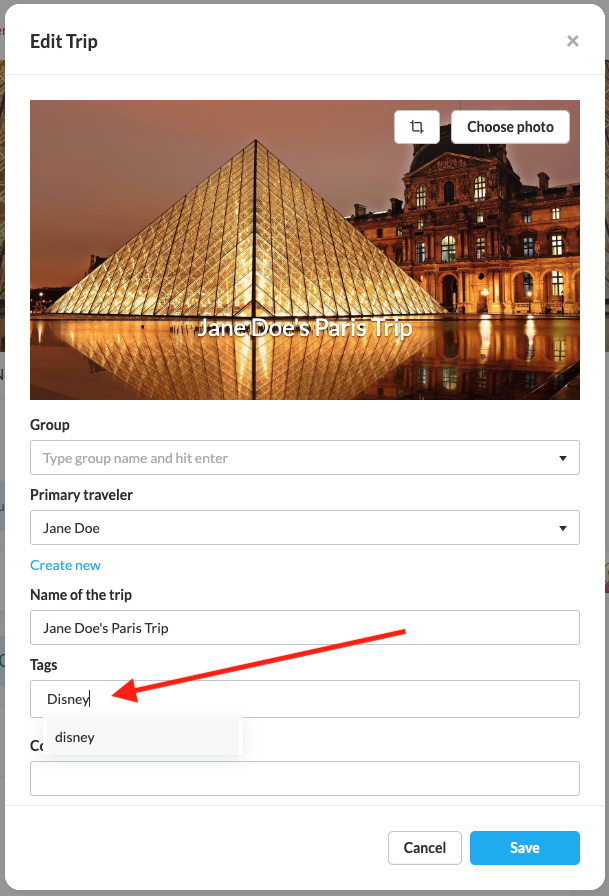 Once selected, it will appear as a blue tag. From here, click "Save" or add any additional tags you've created that suit this trip: