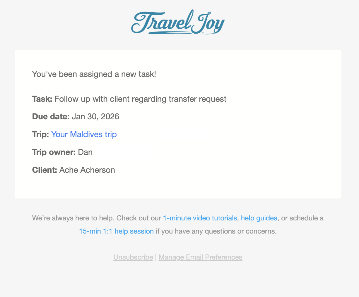 When you create a task, you can assign it to a team member and they’ll receive an email notification. Tasks can be managed from a trip’s Tasks tab or from the Tasks tab in your dashboard. Once assigned, team members can edit the task, mark it as complete, or reassign it if needed. To get started, you must have at least one team member added to your account.