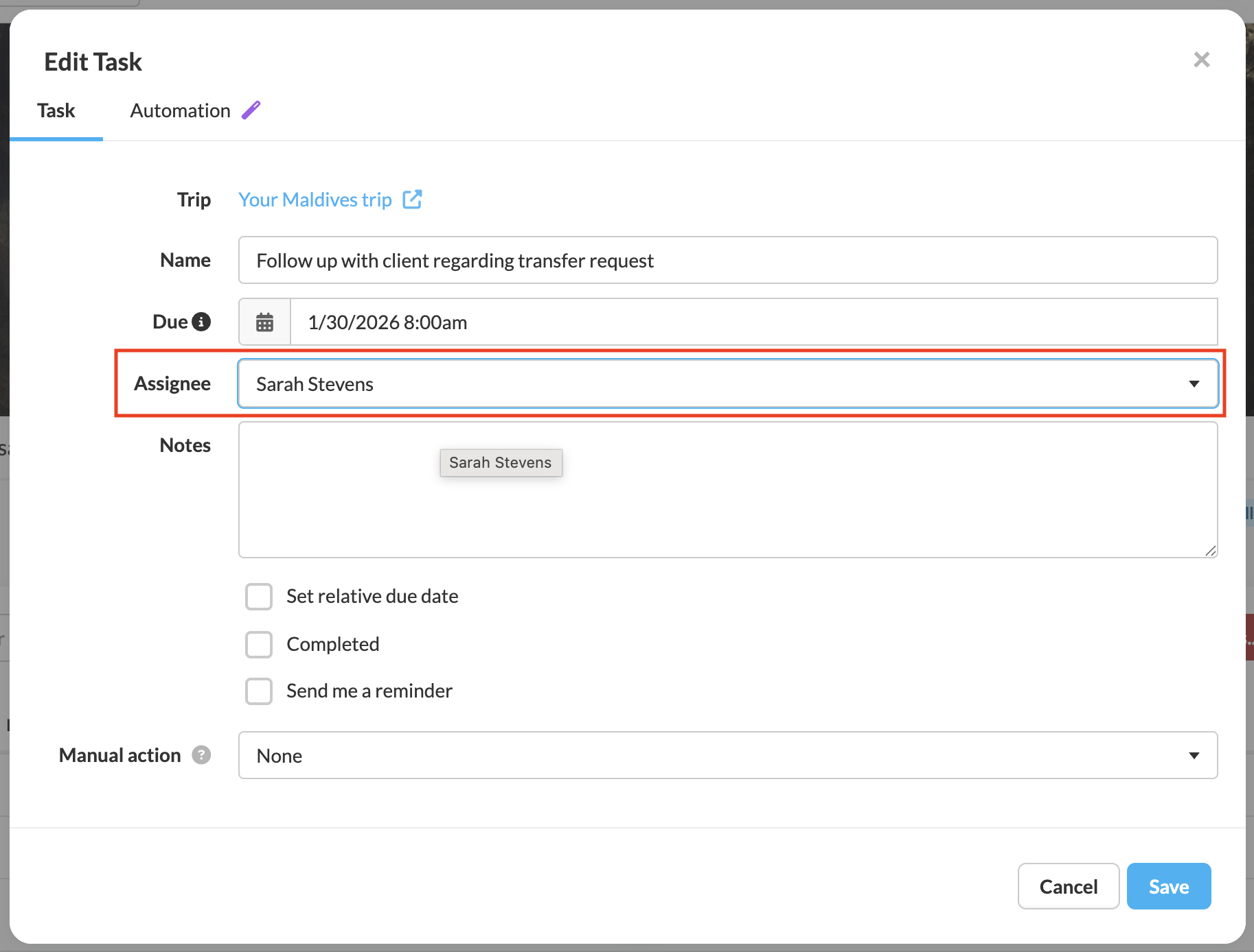 You can assign a task from Trip's task tab or the Tasks tab in your TravelJoy dashboard. When editing the task, look for the field entitled "Assignee":