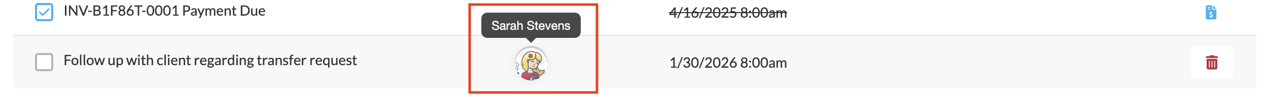 Once the task is saved, you will see the assigned Team member appear within that task: