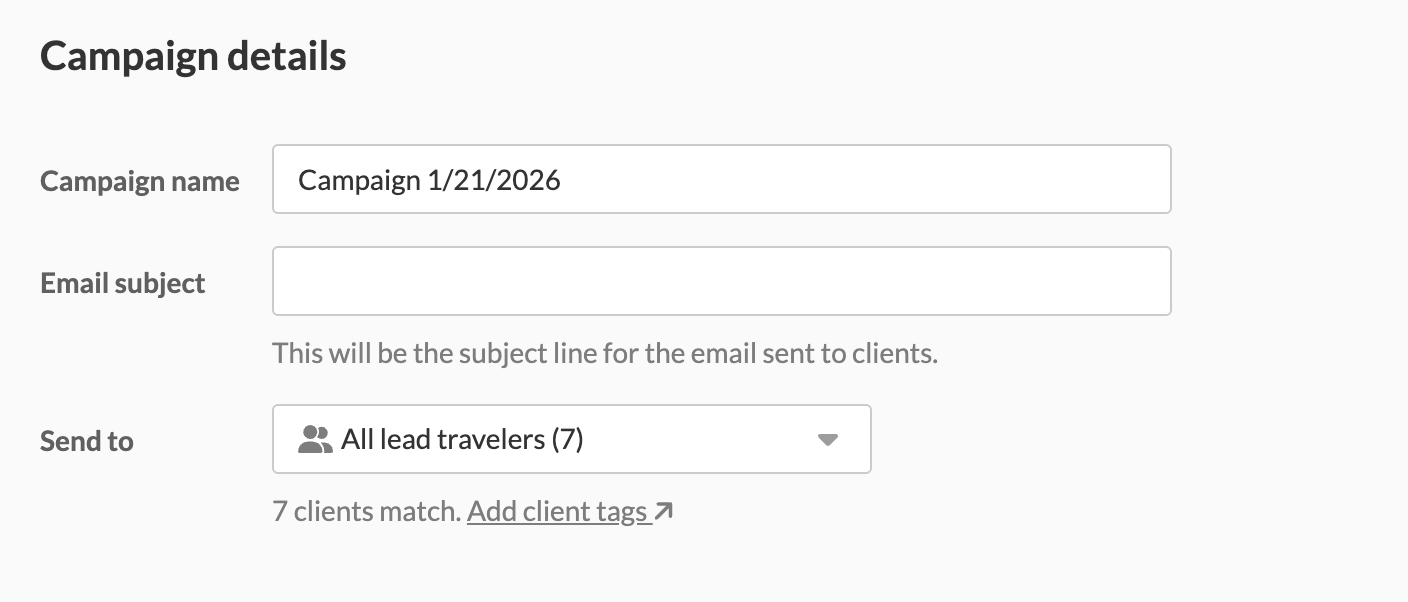 When creating a new campaign, you will first want to give it a name, a subject line for the email, and decide who to send it to (all lead travelers or clients a part of a specific tag).