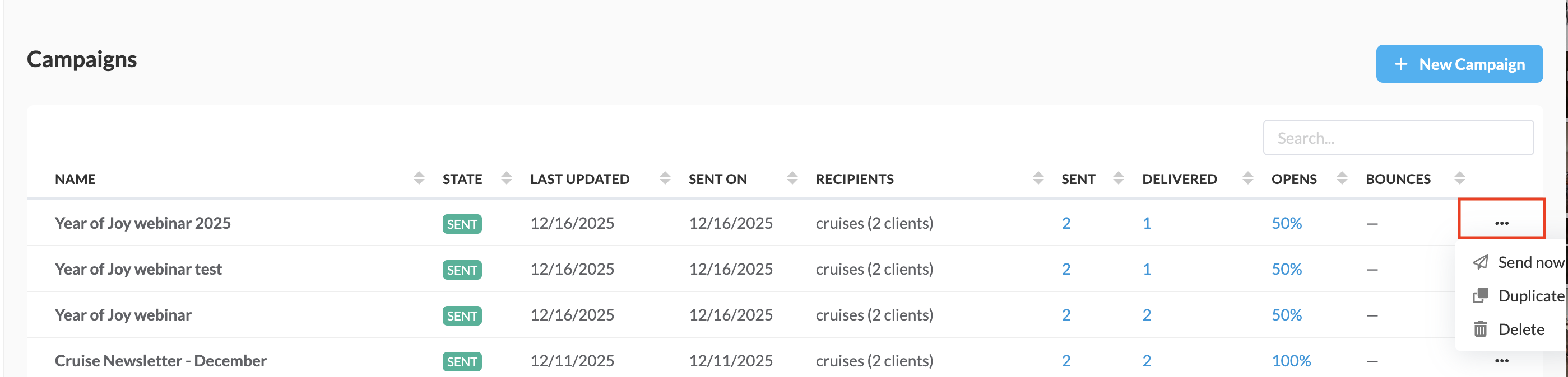 Once a campaign has been sent or saved, you can always come back and edit, send, delete, or duplicate it. To edit it, simply click on the campaign name. To duplicate, send, or delete it, click the action button on the right side of the screen.