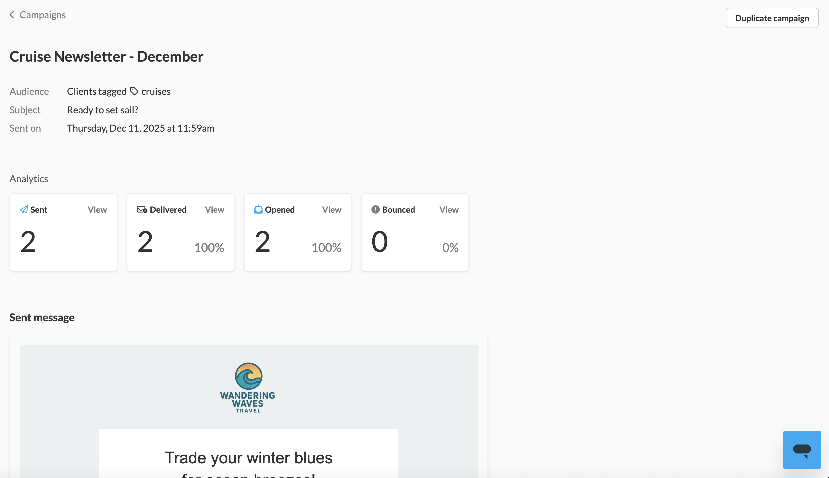 You can even click into the campaign itself to look at the reporting, view the message that was sent, and duplicate the campaign.