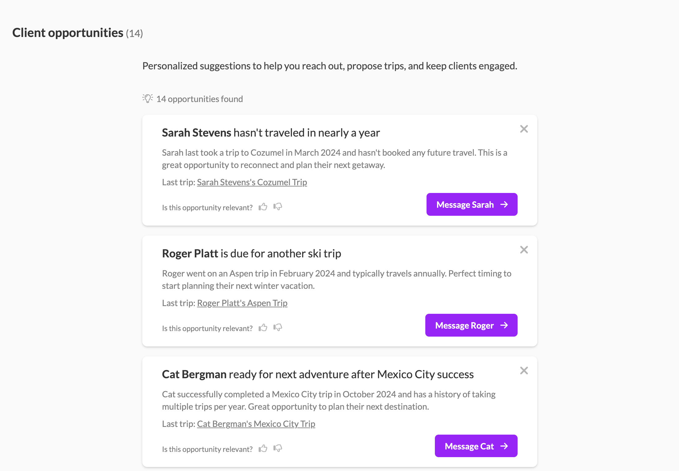 Client opportunities automatically highlights travelers within your account that may be ready for their next trip! TravelJoy will help pinpoint clients who may not have traveled with you in a while and even suggest potential trip themes.Â